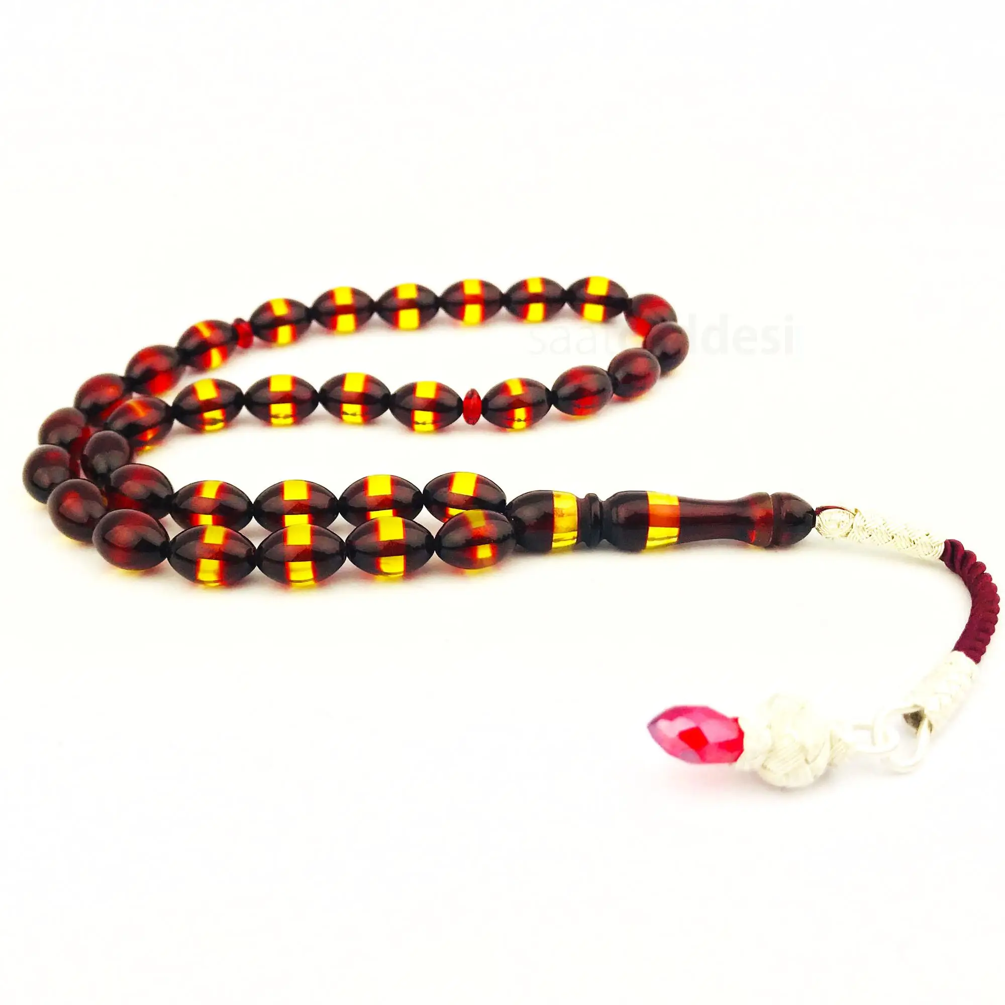 Bu ürünümüz gibi Ateş Kehribar, Sıkma Kehribar, Toz Kehribar isimleri ile satılan tespihler çeşitli kimyasal bileşenlerden oluşturulur. Yapı ve görünüş olarak kehribara benzetilmektedir. Ateş kehribar bileşenleri fenol, formaldehit ve boyadır. İçeriğinde elyaf olmadığı için saydam görünüşlüdür. Sıkma kehribarlar ile ilgili ise, bu taşın kehribar tozları toplanarak sıkıştırılması sonucu oluşturulmuş bir taş olduğunu söyleyen bilgi kaynakları doğru değildir. Sıkma kehribar bakalit ve farklı birçok kimyasal bileşen ile oluşturulmaktadır. Kehribar ismi ile satılan ürünler alırken bu konulara özellikle dikkat edilmesini tavsiye ederiz. Gerçek kehribar diyerek ateş, sıkma veya toz kehribarları satanlara, ateş veya sıkma kehribar diyerek tamamen plastikten yapılmış olan 1-2 liralık tespihleri satanlara karşı dikkatli olmanızı öneririz.