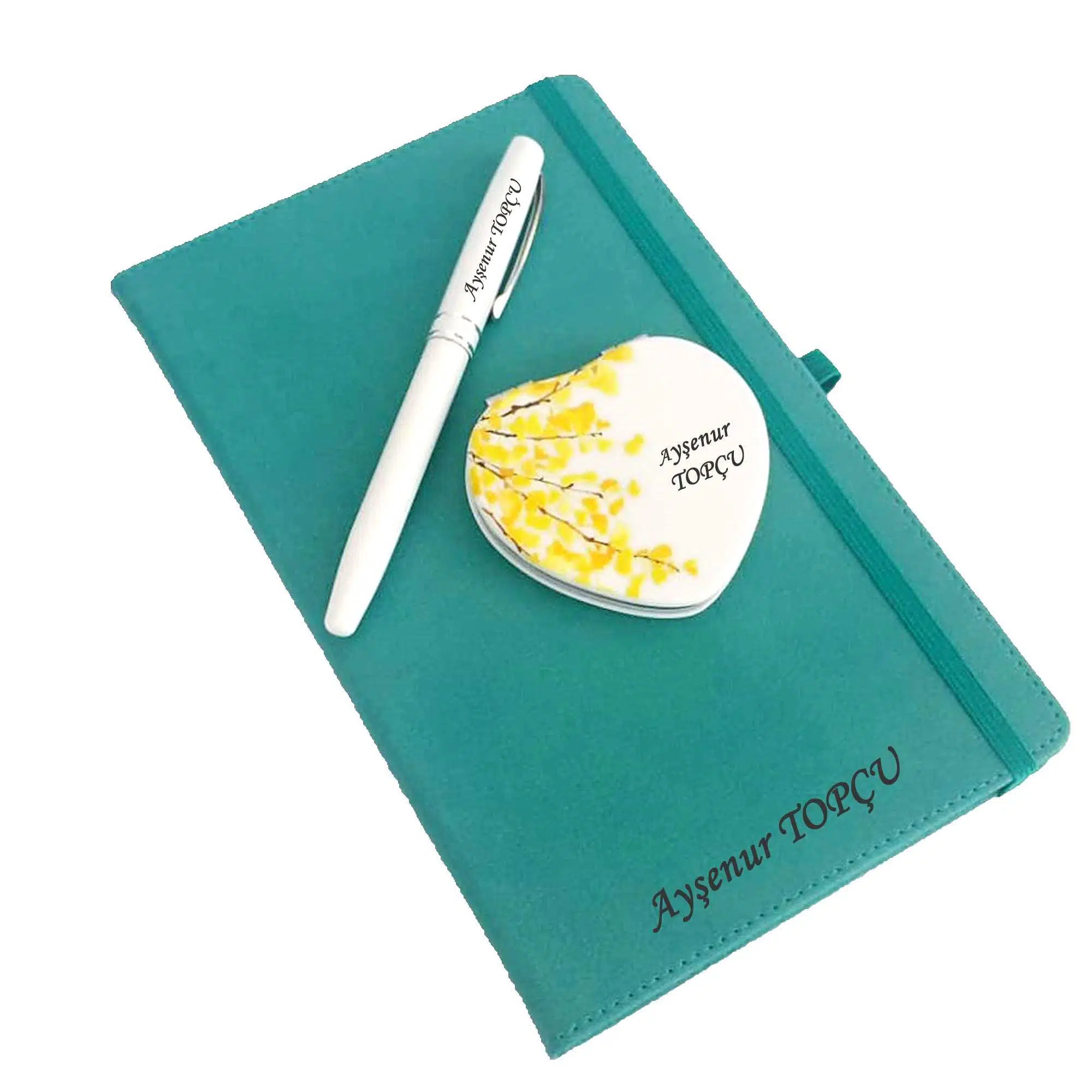 | Etiketler | İsme Kişiye Özel Turkuaz Defter Ayna ve Roller Kalem Seti |