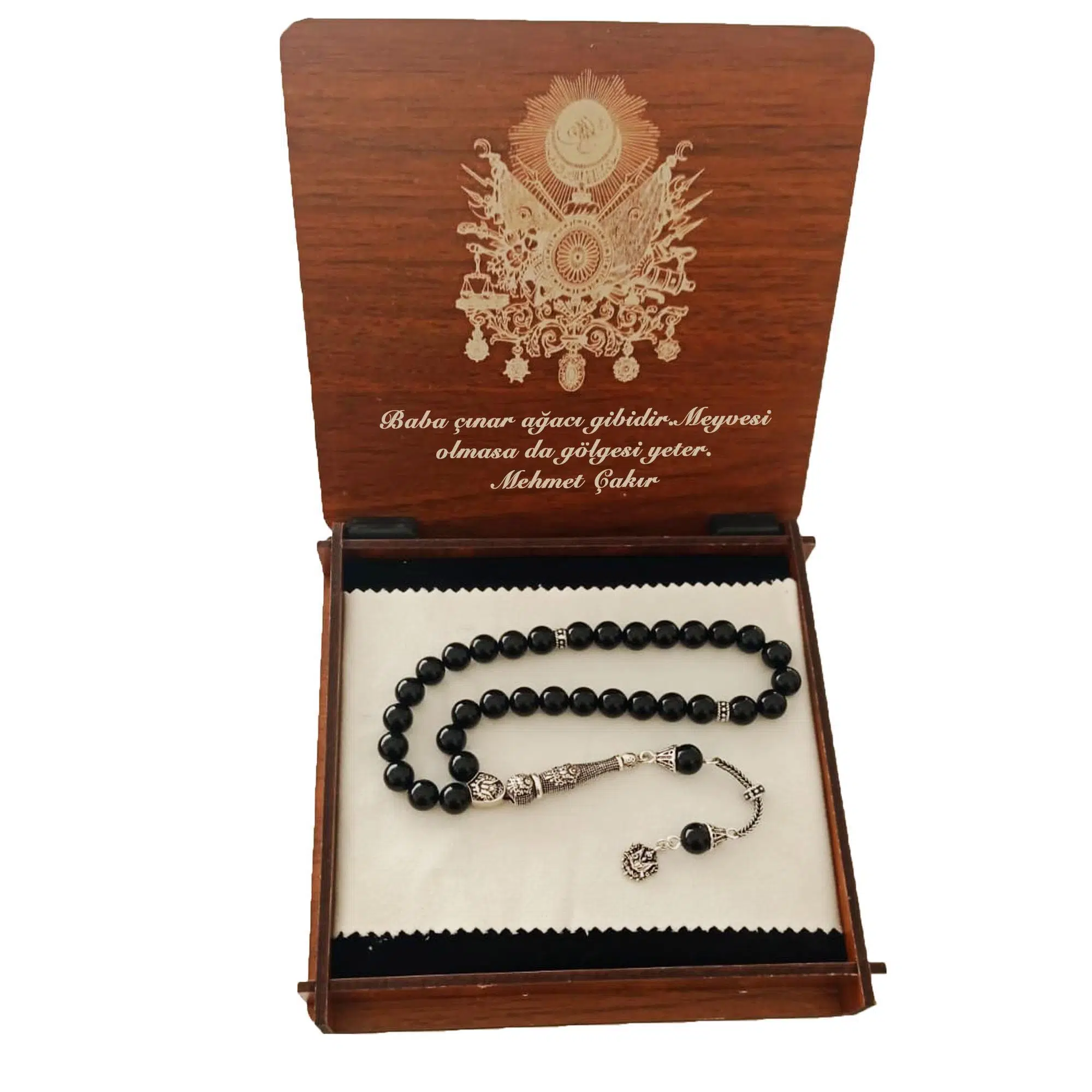 | Etiketler | İsme Özel Ahşap Kutulu Gümüş Osmanlı Armalı Siyah Oniks Tesbih |